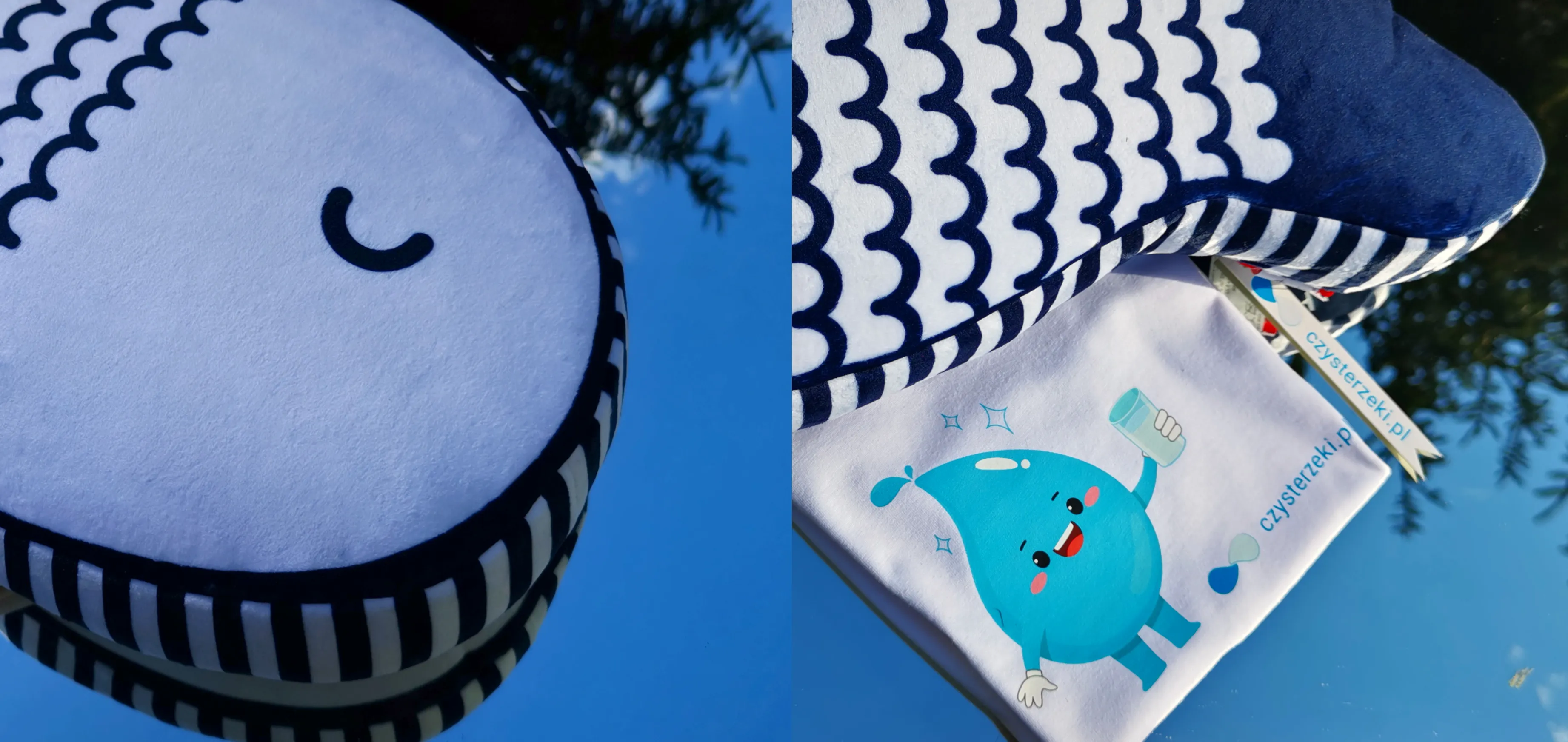 W ramach konkursu zaproponowałyśmy poduszki rybki oraz koszulki z nadrukiem kropelki wody. Produkty te wykonane zostały z materiałów przyjaznych dla dzieci.
