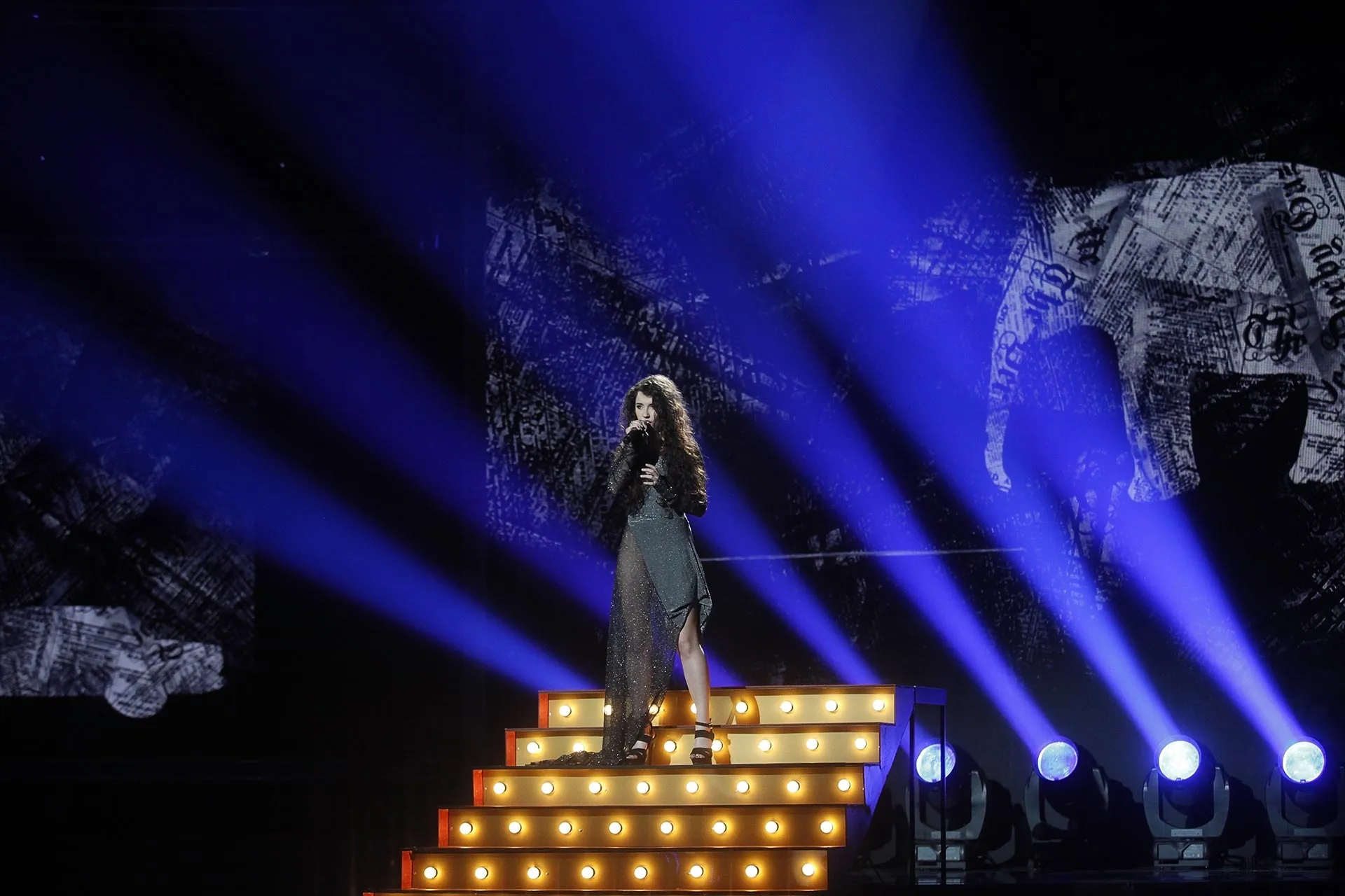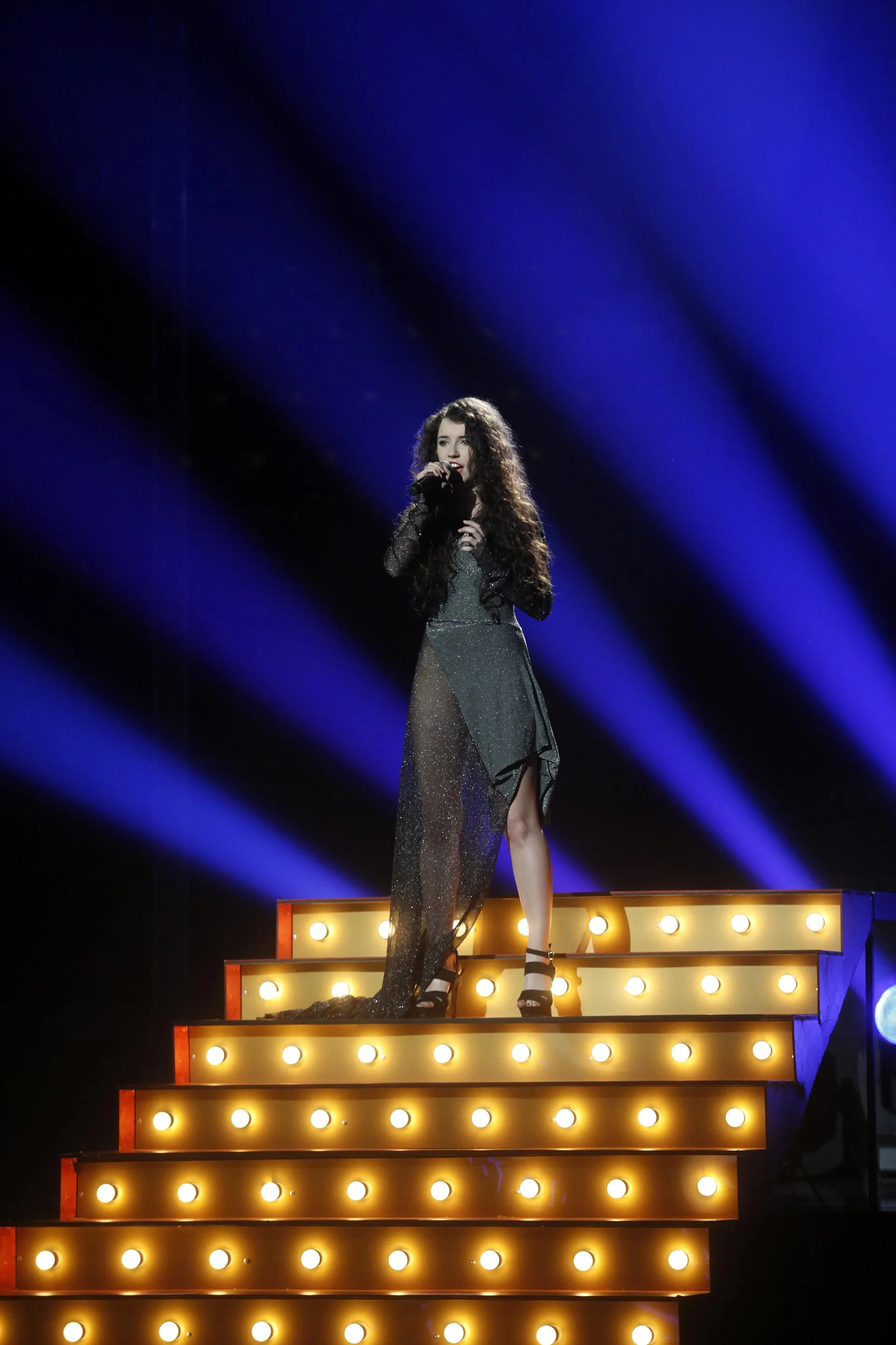 Marta Bijan podczas finałowego występu w programie "X-Factor w TVN. Piosenkarka w lureksowej asymetrycznej sukienka do ziemi naszego projektu.
