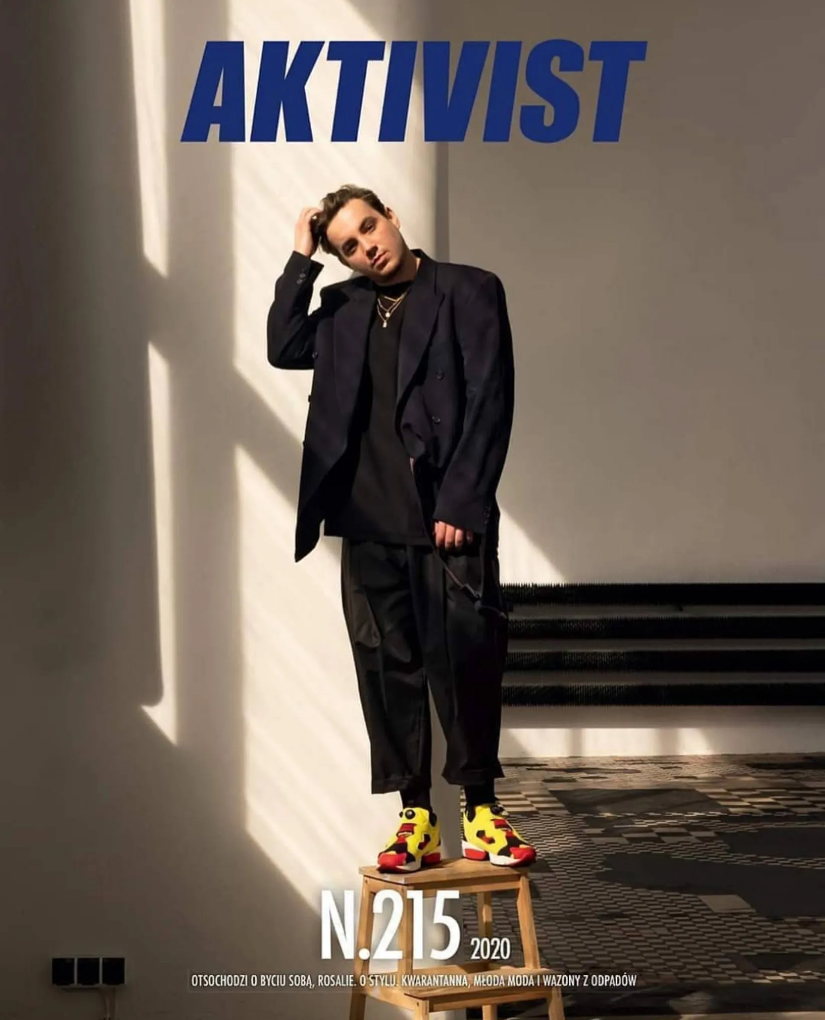 Otsochodzi w czarnych spodniach garniturowych. Sesja zdjęciowa wykonana dla magazynu AKTYVIST przy okazji wywiadu z polski raperem i autorem tekstów.